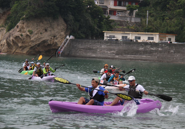 - 岩地海岸では、明日のシーカヤックマラソンのプレイベントとしてミニレースが行われ、参加者は湾内をリレー方式で周回するレースを楽しみました。