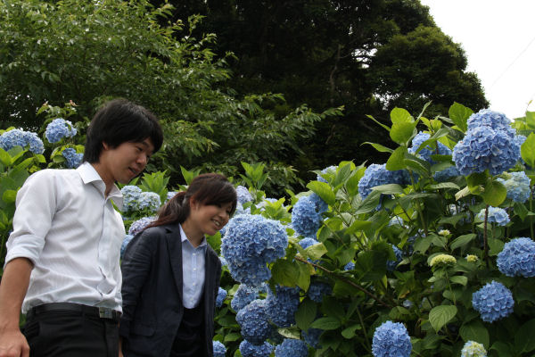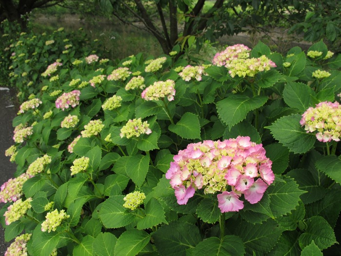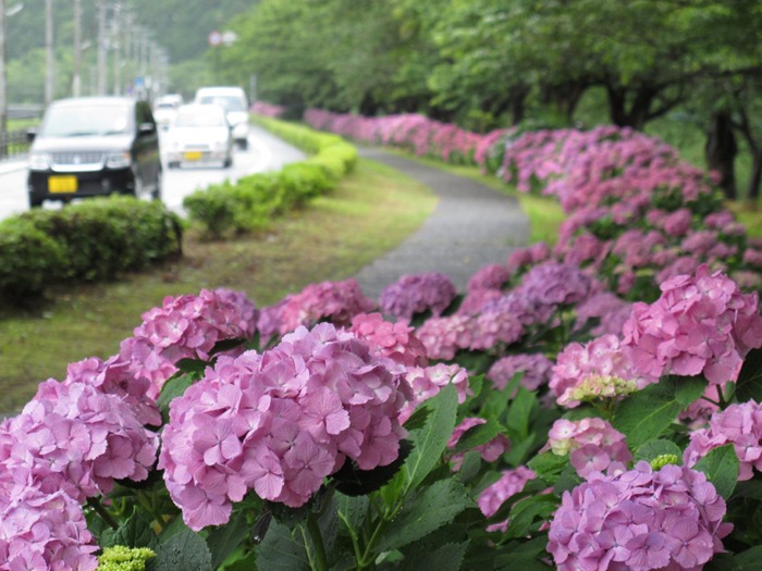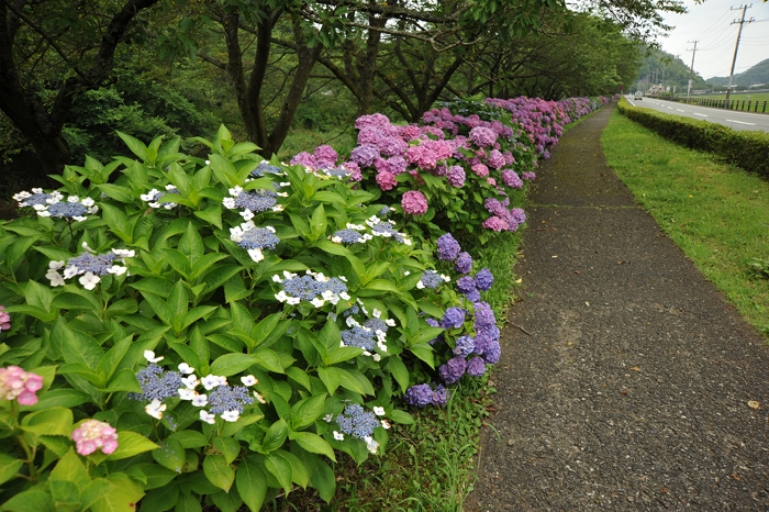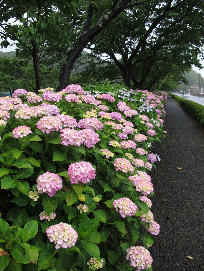 - 那賀バイパスの桜の下に、あじさいがきれいに咲いています。 梅雨を迎えましたが、あじさいはなおいっそう生き生きとしています。