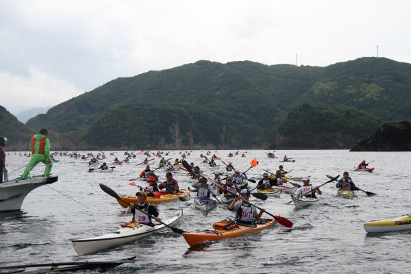 - 岩地海岸では、第14回伊豆松崎シーカヤックマラソンが開催されました。約210艇のカヤックが海面を滑るようにスタートしました。