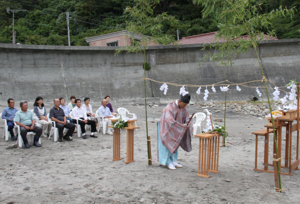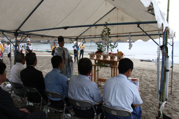 - 同じく岩地海岸では、シーカヤックマラソンの開催に合わせて、夏の期間中の海の安全を祈願する海上安全祈願式が行われました。