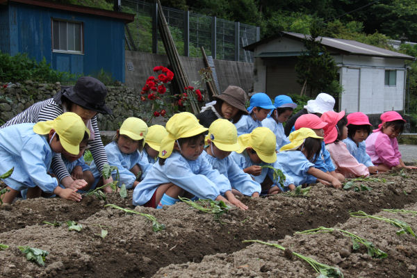 - 松崎幼稚園岩科園では、サツマイモのつるさし体験を行いました。穴を掘り、つるを植え終えると、園児は口ぐちに「できたよ!」と楽しそうに声をはずませ、次々につるが植えられていきました。