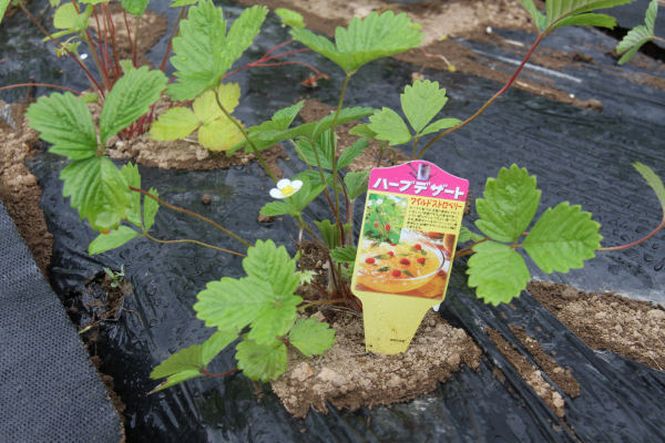 - 5月25日に苗植えを行ったハーブ実証栽培事業の畑では、35種類植えたハーブの内の一つ「ワイルドストロベリー」が実を付けていました。