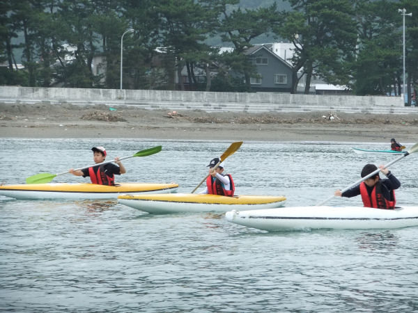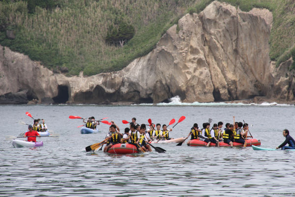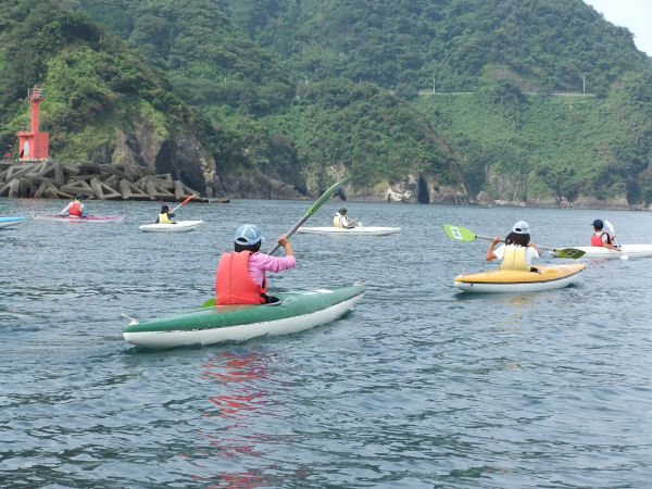 - 今日は静かな海となったので、海洋クラブでは海岸清掃の後、片道約50分をかけて岩地海岸往復のカヌーツーリングに出かけました。