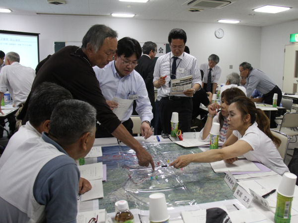 - 那賀川水系河口周辺治水対策委員会の勉強会が開催され、グループごとに机上での避難シュミレーションなどを行いました。