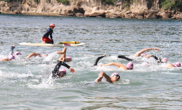 - 岩地海岸では、オーシャンスイムレースが開催されました。1500m、3000m、リレー(3000m)の3つのレースが行われ、泳力を競い合いながらも、参加者全員が泳ぐこと自体をとても楽しんでいる様子でした。
