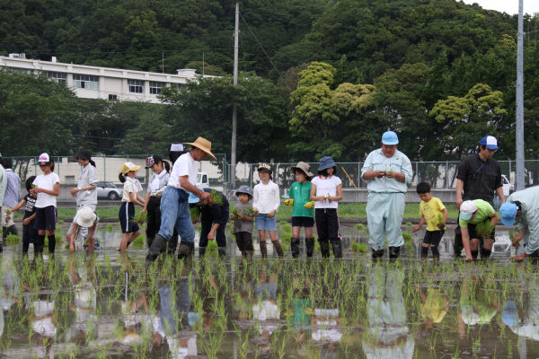- みどりの少年団の6月の活動は、社会福祉協議会の田んぼでの田植え体験です。 団員は、ボランティアの方の指導を受けながら、みんなで協力して稲を植えました。 秋には稲刈りが予定されています。