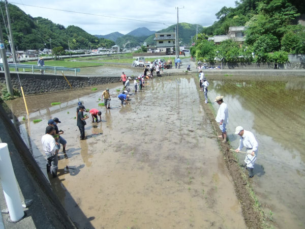 - 桜田地区では、地区の住民と特別支援学校伊豆松崎分校の生徒たちが一緒になって、もち米の苗を植えました。今日植えられたもち米は、秋祭りの餅まき用の餅に利用する予定だそうです。