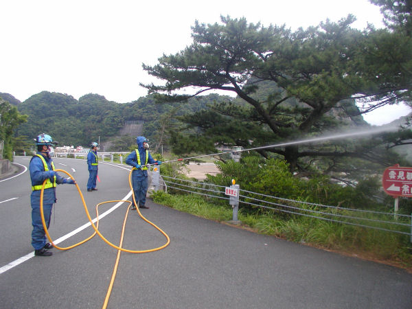 - 早朝、松くい虫防除のための薬剤地上散布が行われました。5月10日に1回目、28日に2回目を散布し、今日実施した3回目の散布で作業が終わりました。