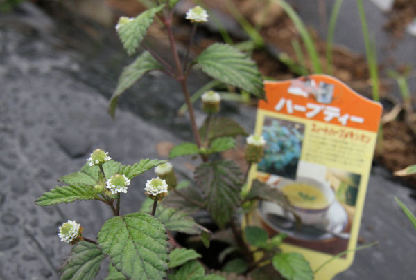 - ハーブ実証栽培事業の畑では、35種類植えたハーブの内の一つ「スィートハーブメキシカン」が花を咲かせていました。直径1cmほどの小さな白い花です。