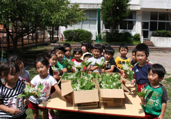 - 姉妹都市の帯広市から市職員の皆様が摘み花束にしてくれたスズランが届きました。 贈っていただいたスズランは町内の保育園や幼稚園、小中学校、町営施設などに配布させていただきました。