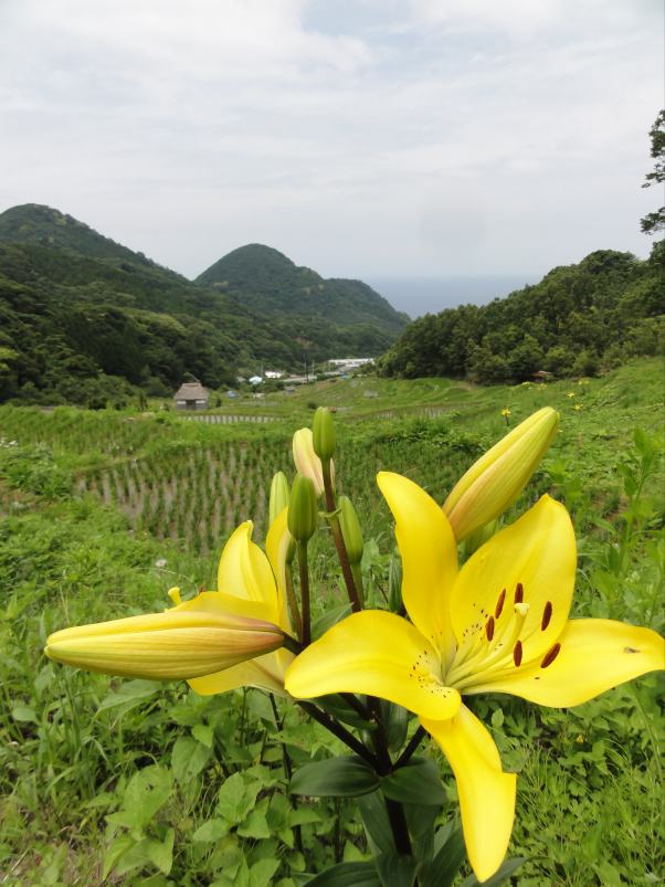 - 石部の棚田では、スカシユリが黄色の大きな花を咲かせ始めました。