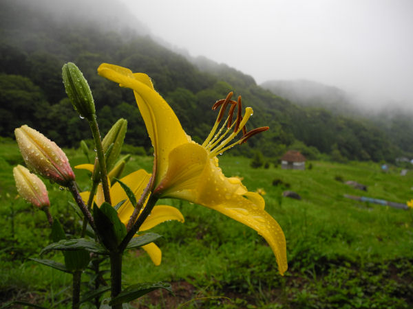 - 今日は雨が降ったりやんだりの一日となりました。 昨日ご紹介した石部の棚田のスカシユリも雨に打たれ、しずくをまとっていました。