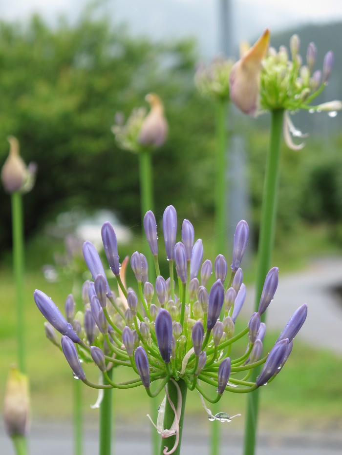 - 今年も梅雨を迎え、町内の花壇ではアガパンサスが青紫色の花を咲かせ始めました。