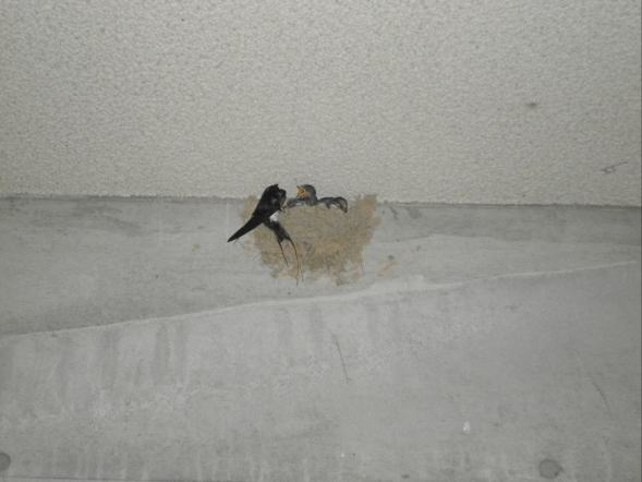 - ツバメの親鳥は、巣にいる雛のために雨の中、頻繁に餌を運んでいました。