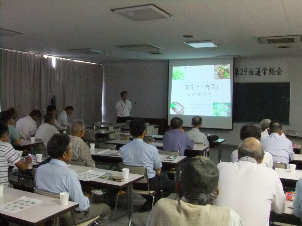 - 環境センター研修室では、農業振興会通常総会が開催されました。総会に続いて行われた講演会では、自生植物を利用した新規野菜の開発「賀茂十一野菜」という演題で、モミジガサなどが紹介されました。