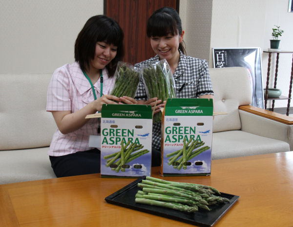 - 姉妹都市の北海道帯広市からアスパラガスが贈られてきました。お贈りいただいたアスパラガスは、共同調理場に届けられ、子どもたちの給食としていただきます。