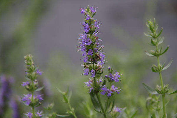 - ハーブ実証栽培事業の畑では、35種類植えたハーブの内の一つ「ヒソップ(パープル)」が紫色の小さな花を咲かせていました。肉や魚の料理に合うハーブだそうです。