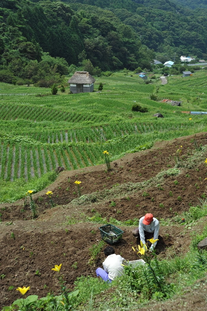 - 今日、石部棚田では高橋村長さんたちが黄花コスモスを植えていました。 稲穂がたわわに実る秋には、きれいな花を咲かせてくれるだろうと話しておられました。
