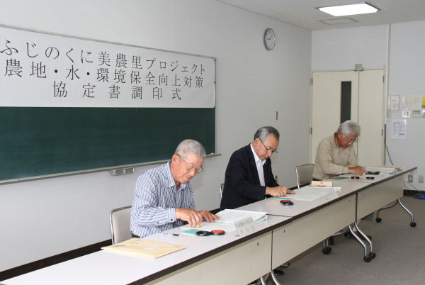 - 農地・水・環境保全向上対策事業に取り組む那賀地区の那賀良くする会と石部棚田・里山を守る会が、それぞれ町と活動の協定を結ぶため、調印式が行われました。 この事業は、地域ぐるみで農地や農業用施設の保全管理と農村の自然や景観などを守る活動を支援するものです。