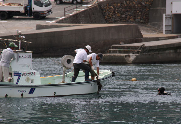 - 雲見漁港では、夏の海水浴やダイビングシーズンを前に、地元の漁業関係者やダイバーなど約50人が参加して、海底清掃を行いました。