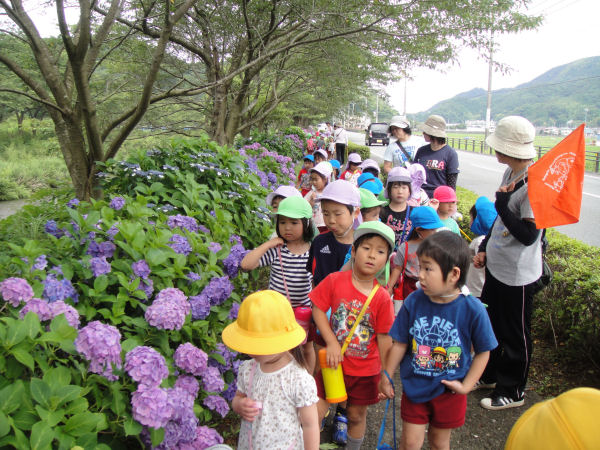 - 那賀バイパスでは、松崎幼稚園中川園の園児たちが、アジサイの並木を眺めながらの散策を楽しんでいました。