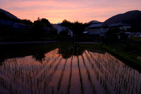 - 昨日の夕焼けの様子です。 田植えの終わった水田になまこ壁の蔵や夕焼けが写り込み、美しい風景でした。
