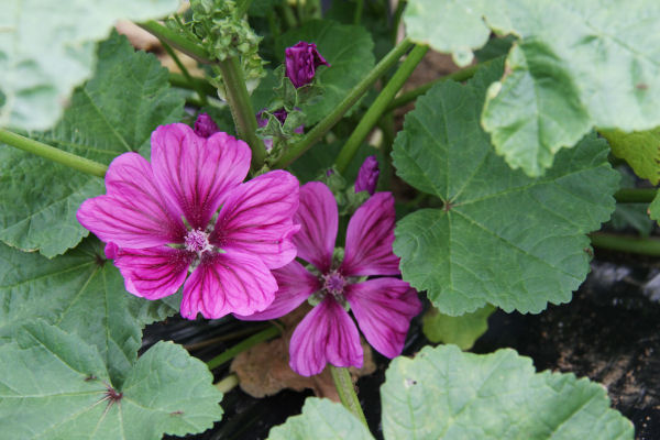 - ハーブ実証栽培事業の畑では、35種類植えたハーブの内の一つ「コモンマロ—」が紫色の花を咲かせていました。
