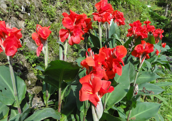 - 町内の花壇などで、カンナが咲いています。 鮮やかな赤い色の花が目を引きます。