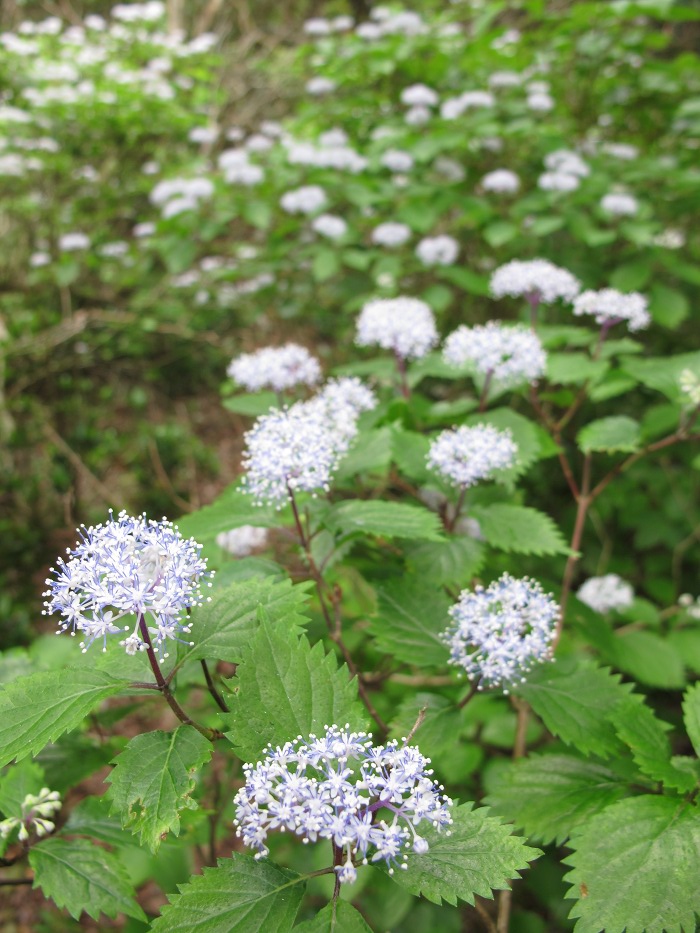 - 長九郎山では、八瀬峠から山頂にかけこあじさいが咲いています。 八瀬の植栽シャクナゲを超えると、群生も見られます。