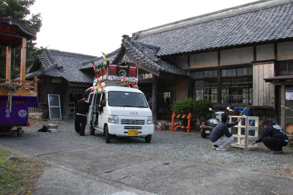- 明日から松崎地区などで秋まつりが始まります。三省社では、地区の方たちが集まり、準備が進められていました。