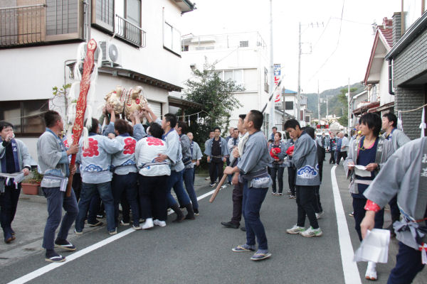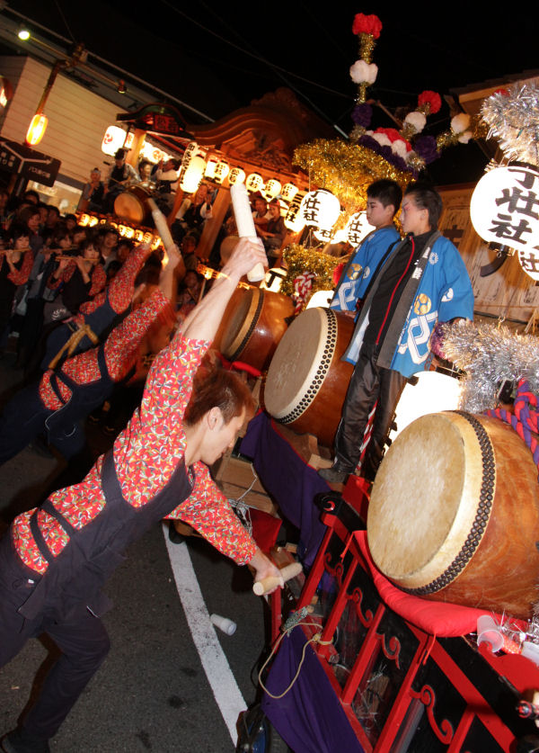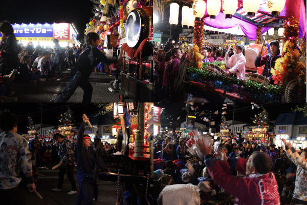 - 昨夜の話題ですが、商店街では、秋祭りの最後を飾る「三社たたき合い」が行われ、最高潮の活気と盛り上がりをみせていました。