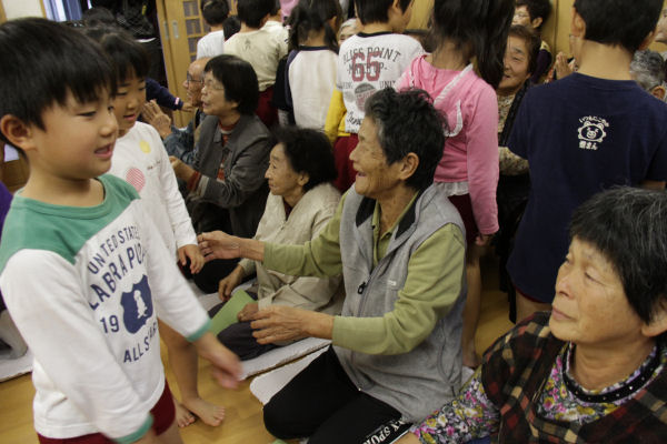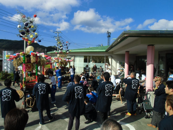- 宮内区の共盟社では、地区内にあるデイサービスセンターを訪問し、お年寄りの方へ太鼓の演奏を披露しました。