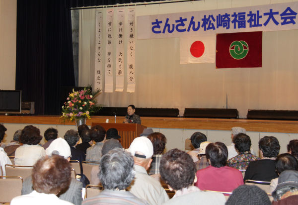 - さんさん松崎福祉大会では、妙清寺住職の深沢貞勝さんを講師にお招きし「尼僧になって36年」という演題での講演が行われました。