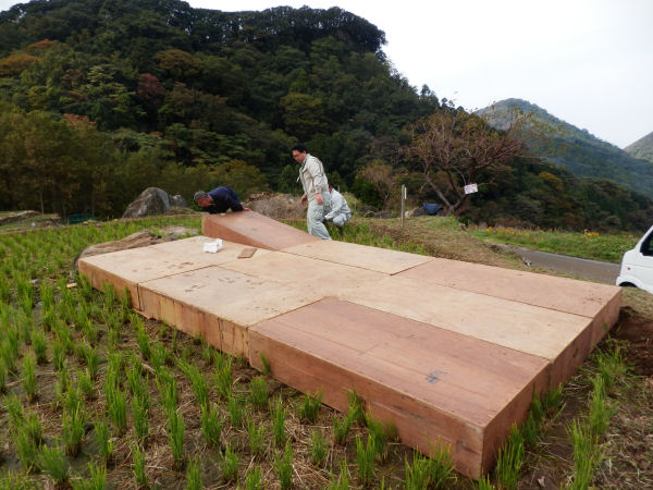- 明日、石部棚田では「石部音楽博覧会」の開催が予定されています。 今日は舞台の設置などの準備が進められていました。