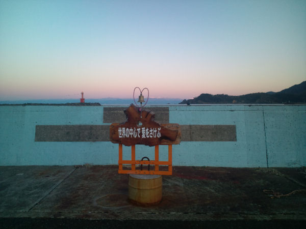 - 旧松崎港からの朝焼けの様子です。グラデーションがとてもきれいでした。 旧松崎港には、セカチューにちなんだモニュメントが設置されています。お立ち寄りの際は、ぜひ鐘を鳴らしてみてください。
