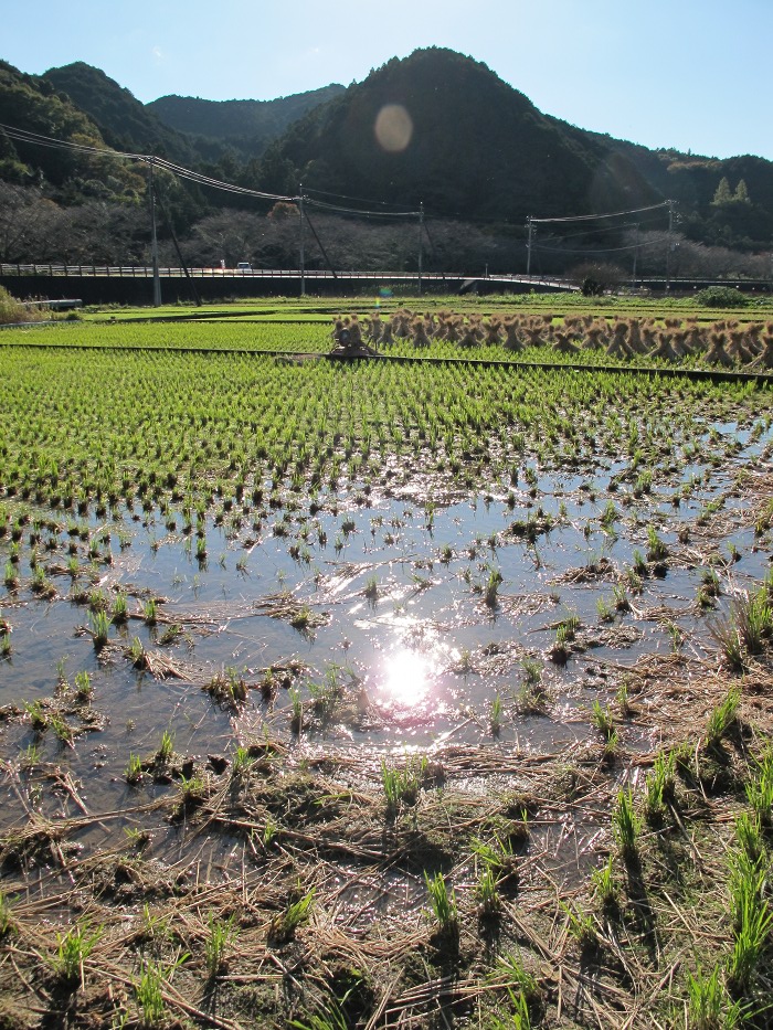 - 昨日までの激しい雨も上がり、今日は快晴の一日となりそうです。 激しい雨の名残の水たまりが、田んぼのあちこちにでき、日の光を映しています。
