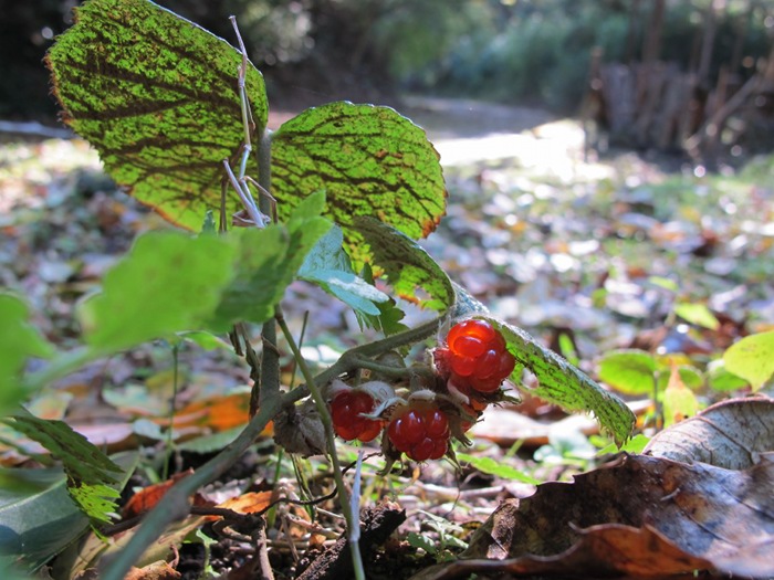 - 今日見つけた冬イチゴです。 「もうそろそろかな」と思い雑木林に分け入って、一つだけ見つけました。 秋の陽を浴び、ルビー色に輝いています。