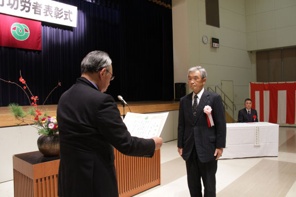 - 環境センター文化ホールでは、平成24年度松崎町功労者表彰式が行われ、人権擁護委員として多年にわたり、町に貢献していただいた土屋重喜さんが表彰されました。
