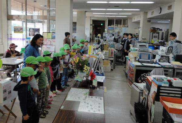 - 聖和保育園の園児が、勤労感謝の日にちなみ、日ごろのお礼にと、役場を訪れ、歌などを披露してくれました。