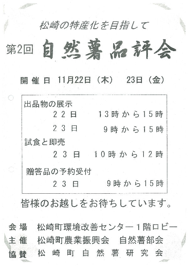 - 昨日に引き続き行われている自然薯品評会では、今日、自然薯の試食と販売が行われました。試食した方からは「粘りが良いね」などの声が多く、好評でした。
