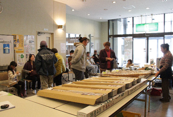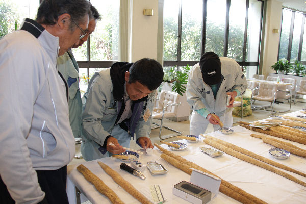 - 環境センターロビーでは、自然薯品評会の出品物が展示されており、来場者は、形状など、自然薯の品質を確かめるように、じっくりと見学していました。