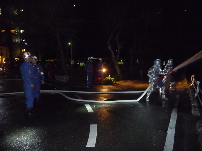 - 昨日の話題です。 24日は松崎町の大火記念日です。 松崎町消防団では、江奈地区の火災を想定した招集訓練が行われました。 第1分団、第2分団の消防車6台が出動し、連携のとれた動きで、放水訓練を行いました。