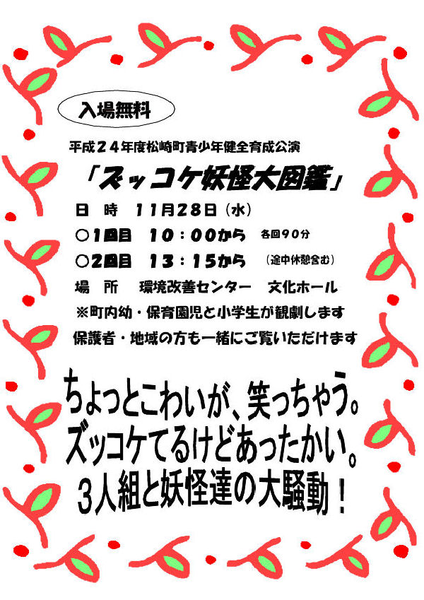 - 環境センター文化ホールでは、28日(水)に青少年健全育成公演「ズッコケ妖怪大図鑑」が予定されています。 ぜひ、ご来場ください。