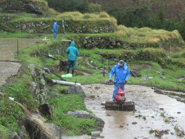 - 石部棚田では、雨の中代掻きの作業が行われていました。4月下旬には、畦塗り作業も予定されています。