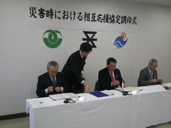 - 災害時における相互応援協定を松崎町と長泉町、西伊豆町と長泉町の間でそれぞれ締結するため、調印式が行われました。
