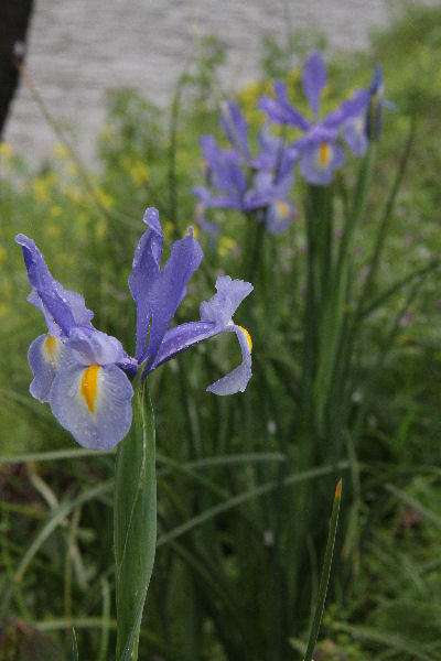 - 歩道沿いで、アヤメの花がきれいに咲いていました。