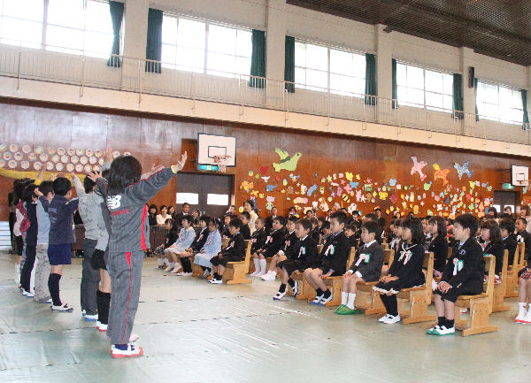 - 交通安全リーダー委嘱式が行われ、松崎小学校の6年生が交通安全リーダーになりました。