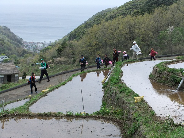 - 石部の棚田でオーナー、トラストの皆さんが棚田保存会の指導を受け、畦塗り作業を行いました。