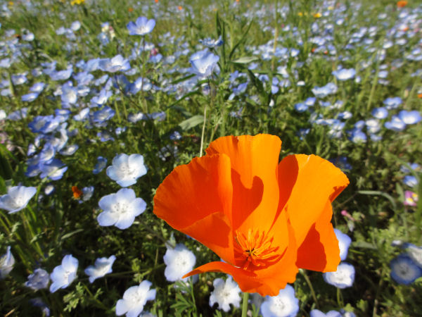 - 那賀の田んぼをつかった花畑では、試験的にまいたカリフォルニアポピーが開花しはじめました。数は少ないですが、鮮やかなオレンジ色が目立っています。
