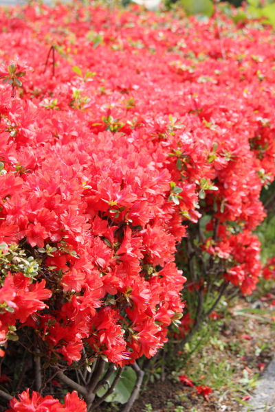 - 町内のツツジの開花が進んでします。「道の駅」花の三聖苑では、真っ赤なツツジがたくさんの花を咲かせていました。